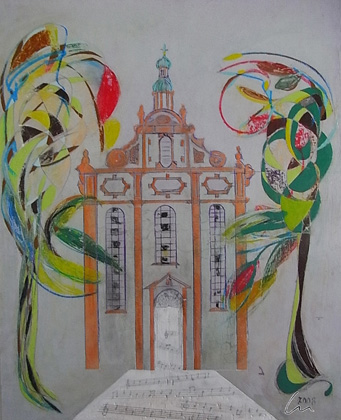„Natur – Kirche – Barock – Musik“ Die Barockarchitektur, eingebunden in eine formenreiche Naturgestaltung, fließt harmonisch in eine Schöpfungsvorstellung ein. Die „Notenblätter“ (Musik), ein wichtiges Bindeglied in der Liturgie, sind Brücke aus einer oft strengen Sakralität in eine fröhliche, offene Menschlichkeit.
